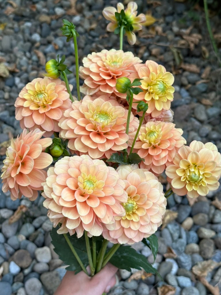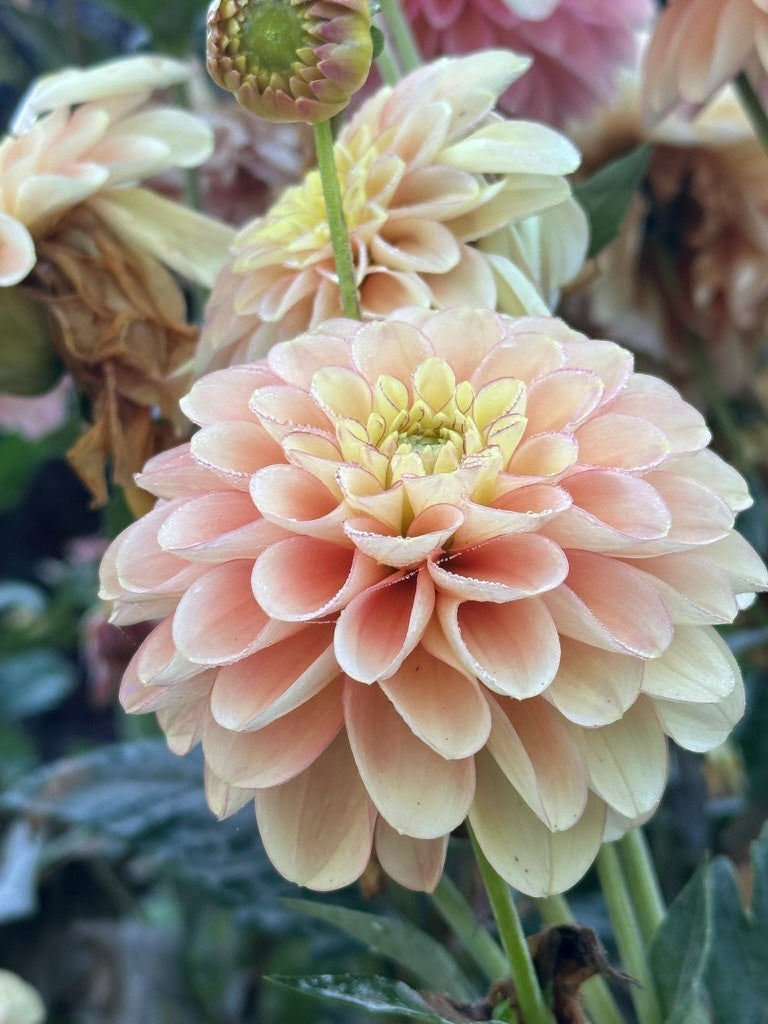 Eva has a lot going for her, with beautiful 3-3.5” peachy blooms that are upward facing with picottee edging on each petal. Centers are consistently closed or green. The plant is 4’ tall and doesn’t require disbudding. The stems are perfect for bouquets. Eva is a mid-season bloomer in my PNW garden, and always steals the show as fall rolls around.