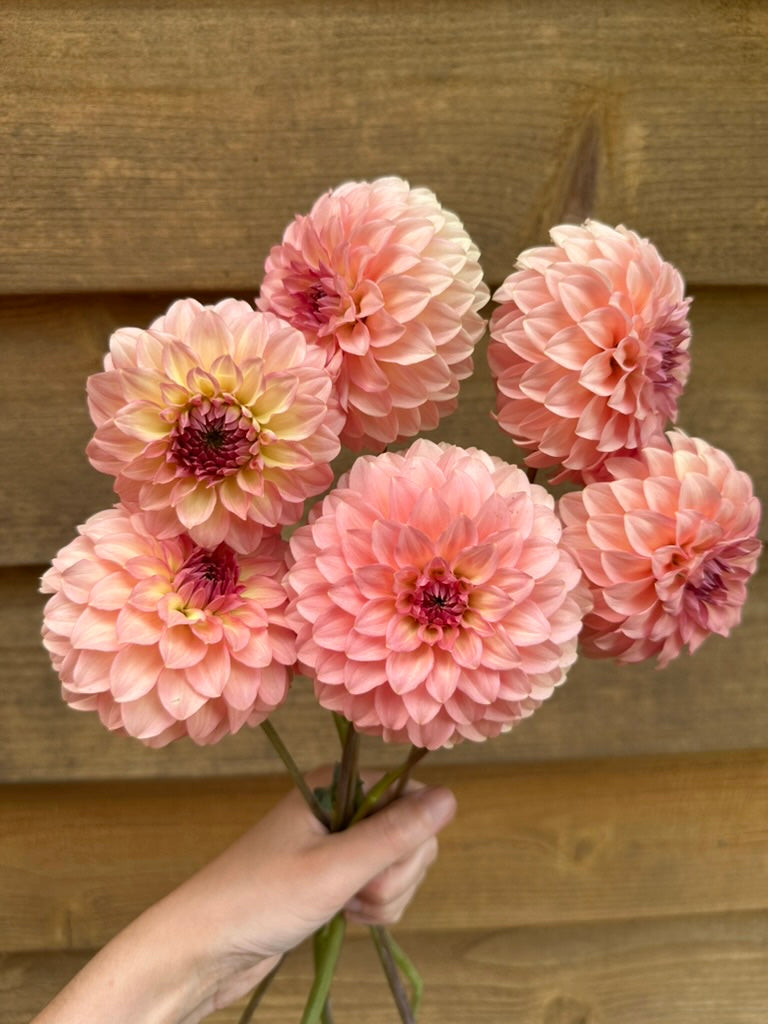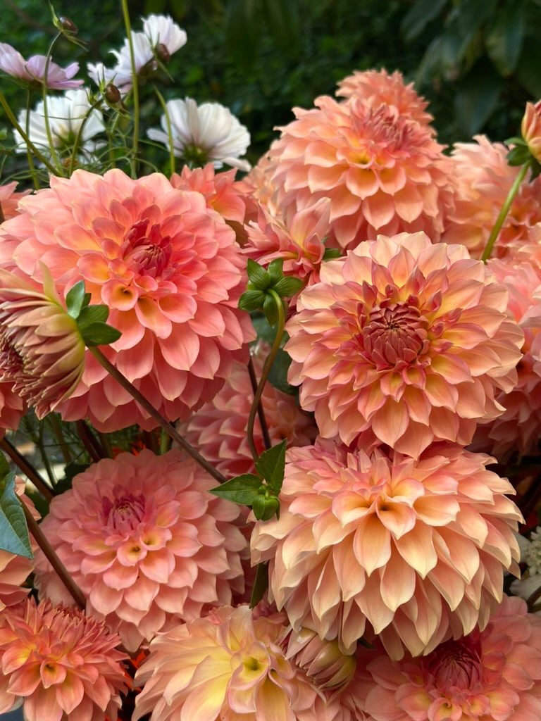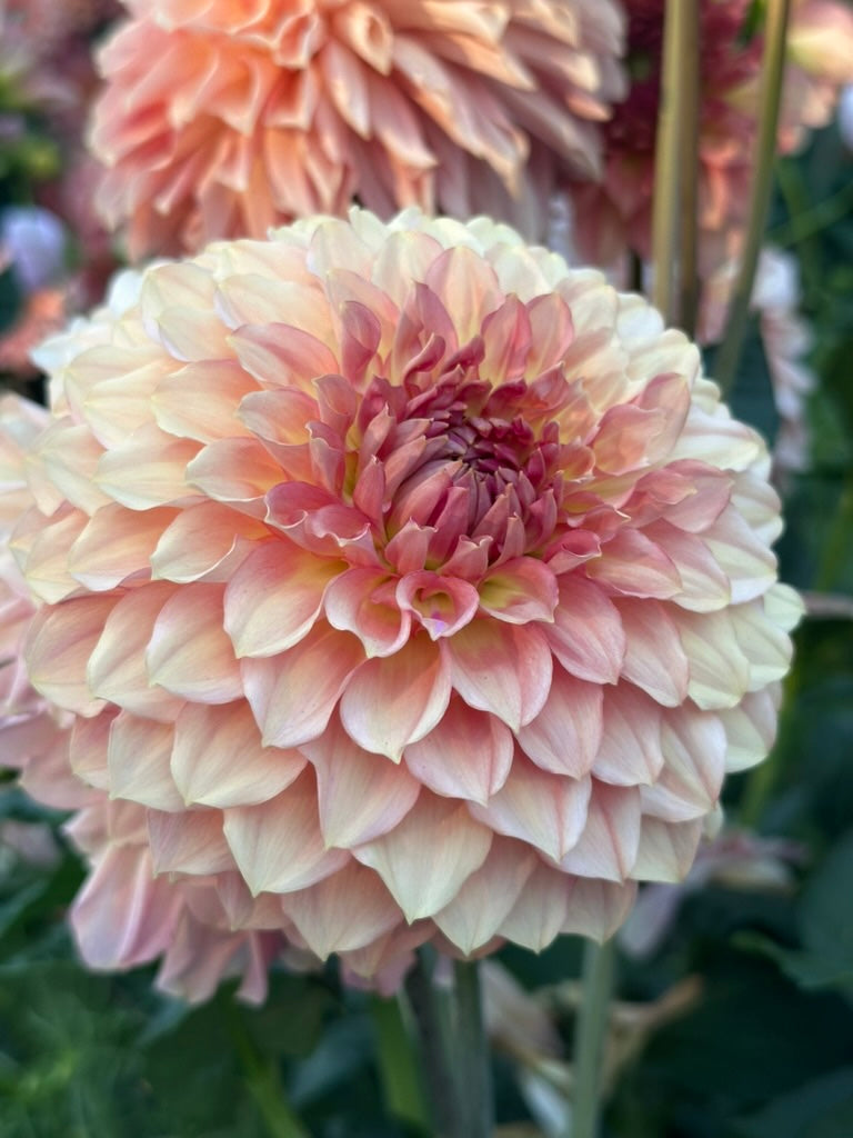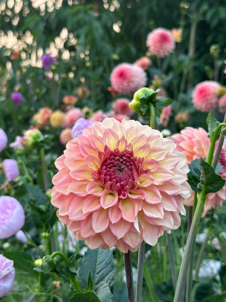 This dahlia holds a truly special place in our hearts, and it has been a long road to get to this special moment! Burfoot Freestone was the first ever seedling that bloomed in our garden— can you believe it?! This beauty is all peach, all day. Packed centers unfold row after row of delicately lined, waved petals in all shades of peach.