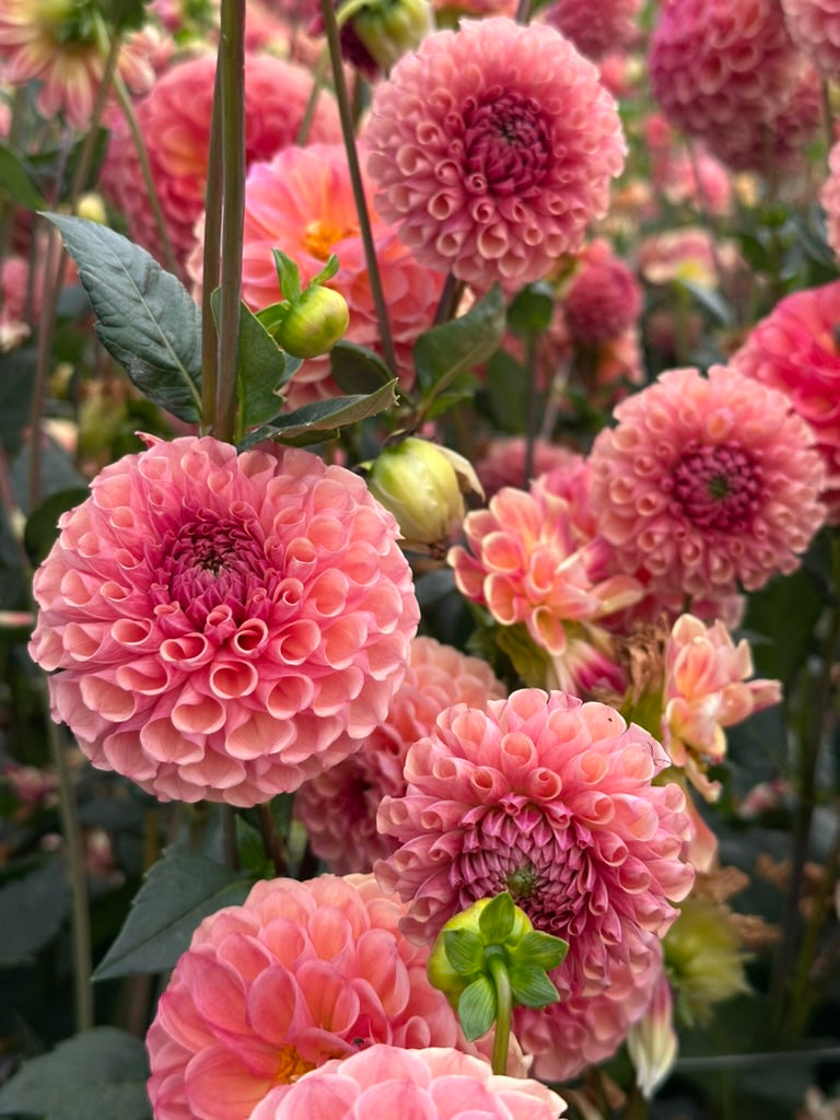This textured bronzy ball is so charming! The petals are packed in, creating a unique squished shape that reminds me of tubular pasta. Pasta is a cut flower dream. The stems are perfectly straight, long and sturdy, with leaves angled upward making them quick and easy to strip.
