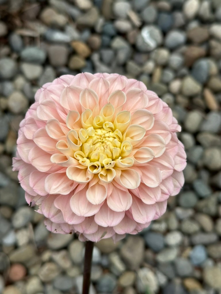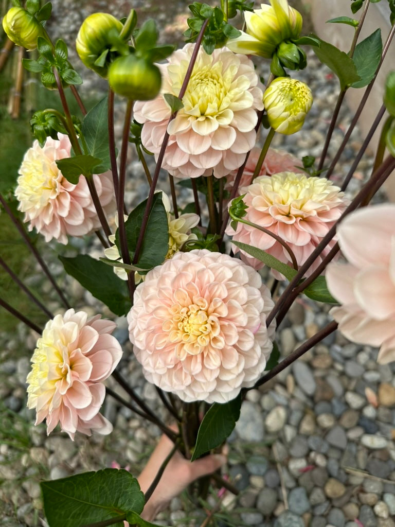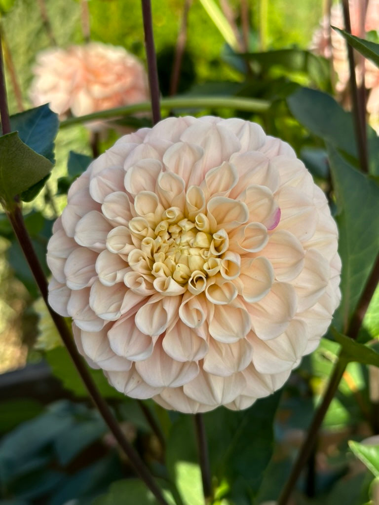 This dahlia is so charming! Curled petals are packed into a dense, long lasting bloom on long, super dark stems! Soft blush melts into a glowing center, making it a beautiful pastel blender in bouquets!